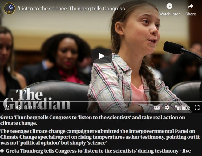 - Severn repeats “I’m only a child”, yet the message appears to be: “listen to the children!“. Greta’s central message is “Listen to the scientists!“