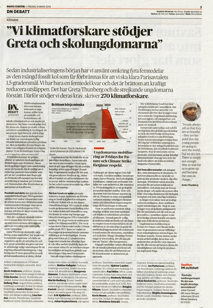 From the largest Swedish daily newspaper “Dagens Nyheter” 15 March 2019, in translation “We climate researchers support Greta and the school children” (270 climate scientists signing):