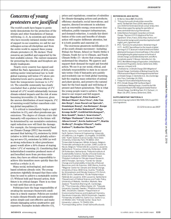 Letter in the leading scientific journal “Science” 12 April 2019, “Concerns of young protesters are justified” (I haven’t had the time to count them, but the signing scientists takes up 51 pages!):